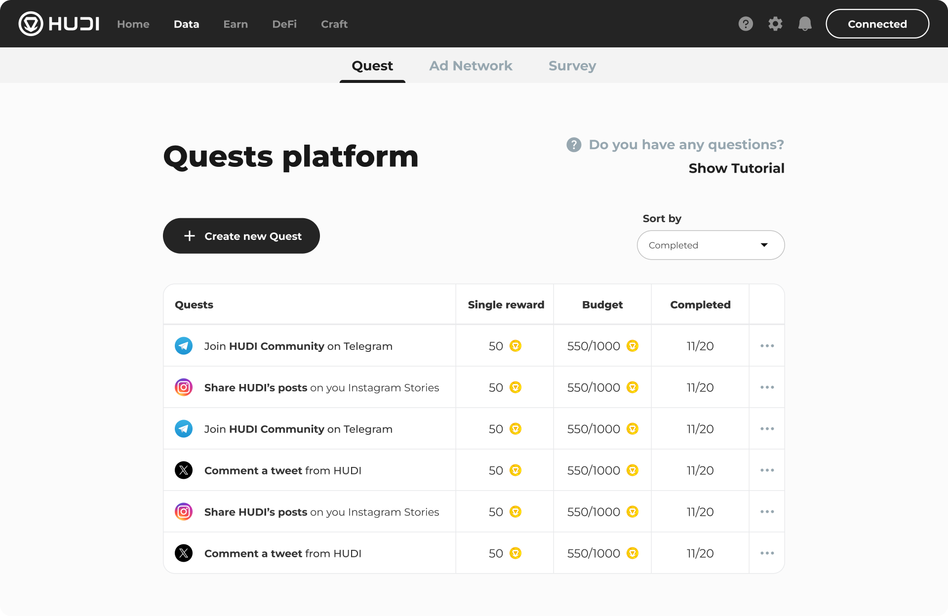 The Quest section allows you to create and manage quests that can engage the HUDI community. These quests can include tasks such as joining the HUDI community on Telegram, sharing HUDI’s posts on social media, or commenting on tweets. Each quest is customizable in terms of rewards, budget, and completion metrics, offering an interactive way to build community engagement.