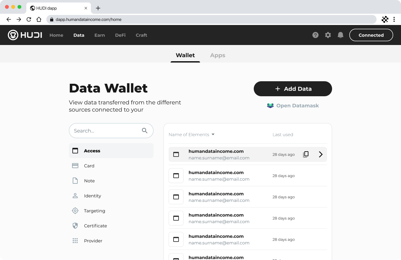 While you can manage your data directly through the dApp, the Data Wallet is also fully integrated with DataMask, HUDI’s dedicated Data Wallet app, providing enhanced security and convenience. Whether accessing your accounts, notes, identities, or other data types, the dApp ensures that your information is organized and accessible with a few clicks.