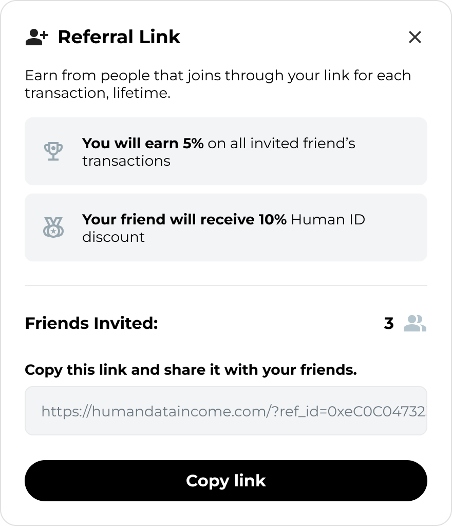 Referral System: Earn rewards by inviting friends to join HUDI. Each time an invited friend completes a transaction, you earn 5% of the transaction value. Your friend receives a 10% discount on their Human ID. This referral link can be easily copied and shared across social media or direct messages.